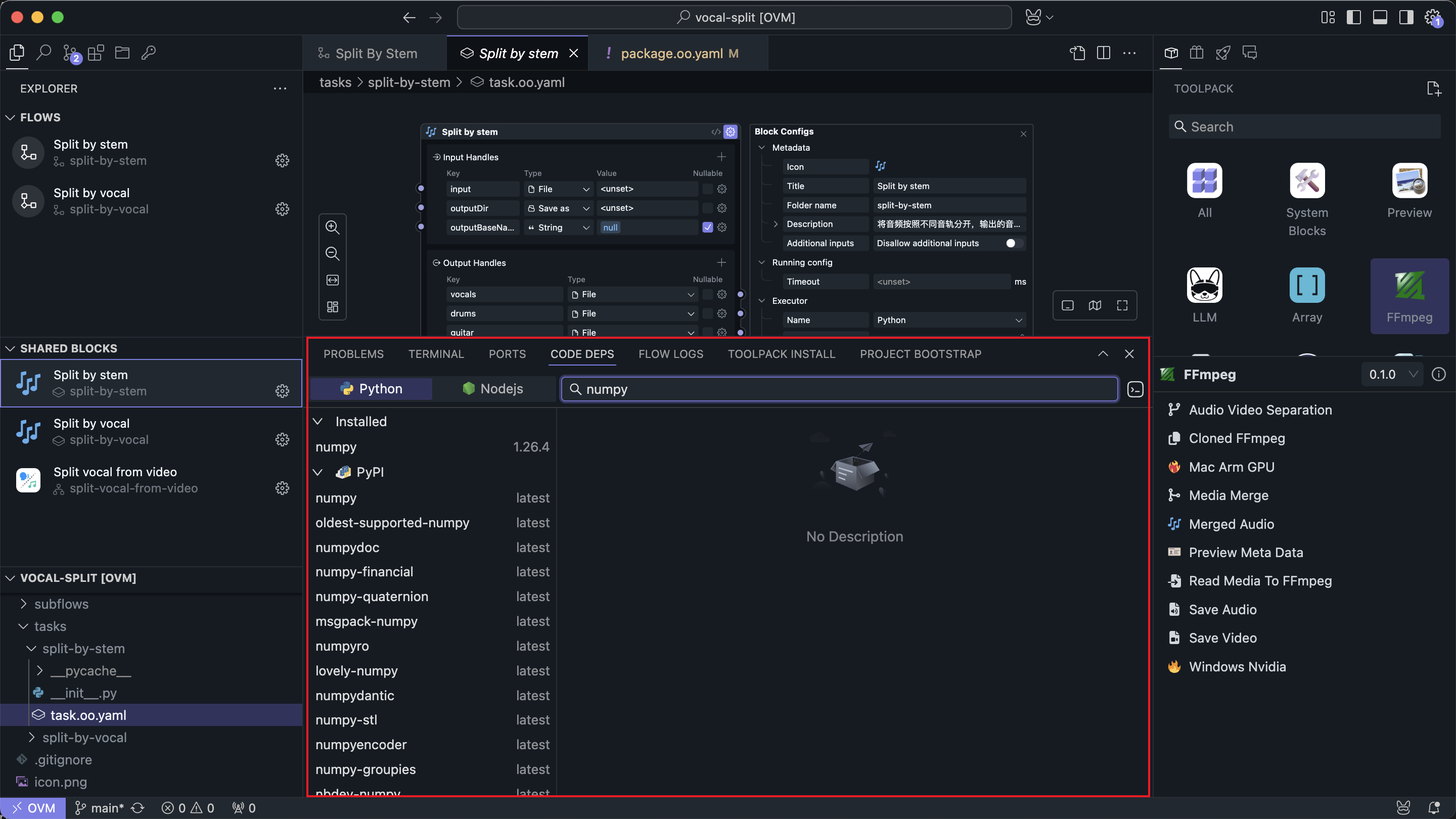 The process of writing code is as smooth as in a familiar IDE. You can use Python, TypeScript, and JavaScript to write code. In oomol studio, dependency management uses a containerized solution to ensure stability. When you need to use a third-party library, you can ensure that the version and behavior of the third-party library remain consistent when the workflow runs on any machine. There is no need for users to manually handle virtual environments or package installations, and common libraries are available out of the box.
