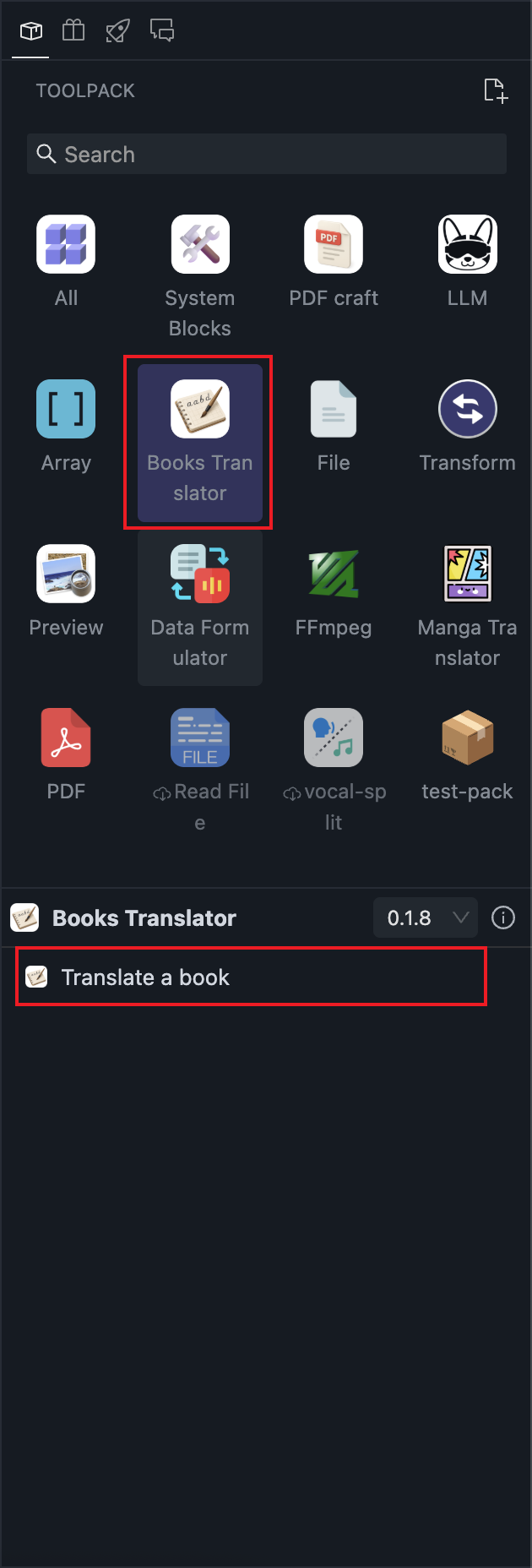Then, we use the Analys PDF and Genrate EPUB Blocks from the pdf-craft Package, and the Translate epub book Block from the books-translator Package, chaining them together to form the Workflow.