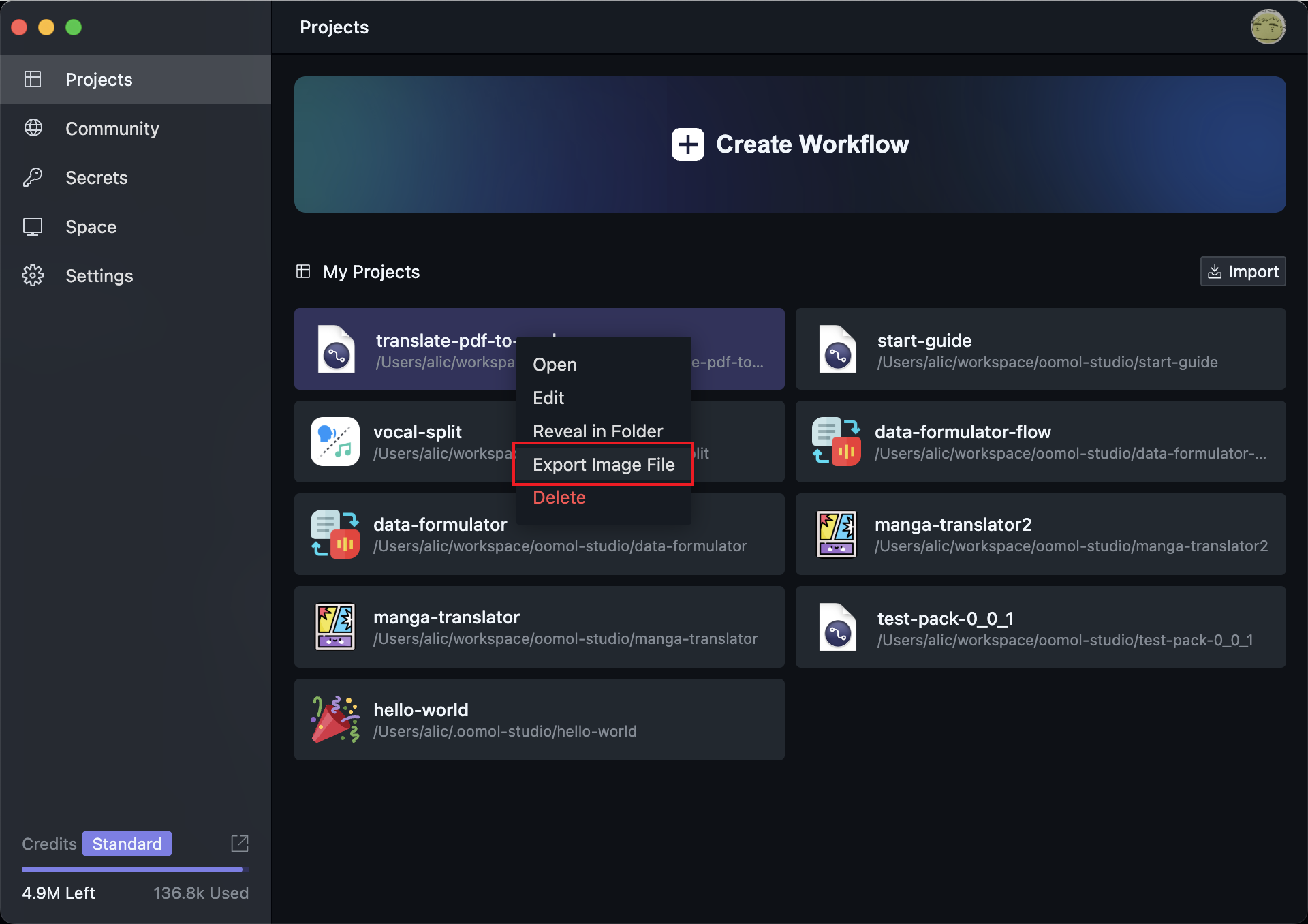 Return to the OOMOL Studio Home page, find the Workflow you just developed, right-click and select Export as Image, choose the export folder, and after a while, you will get an image file with the same name as the Workflow.
