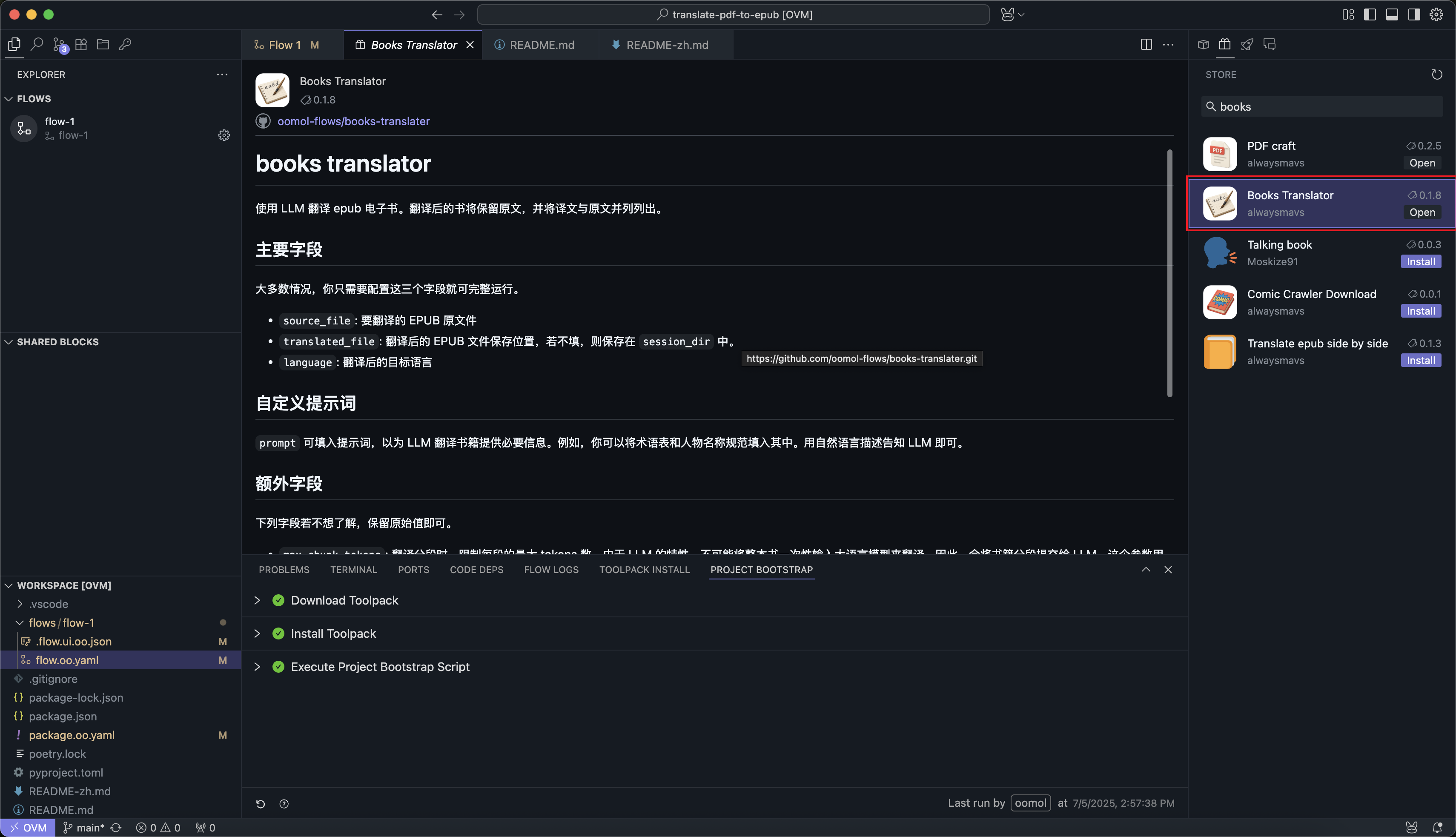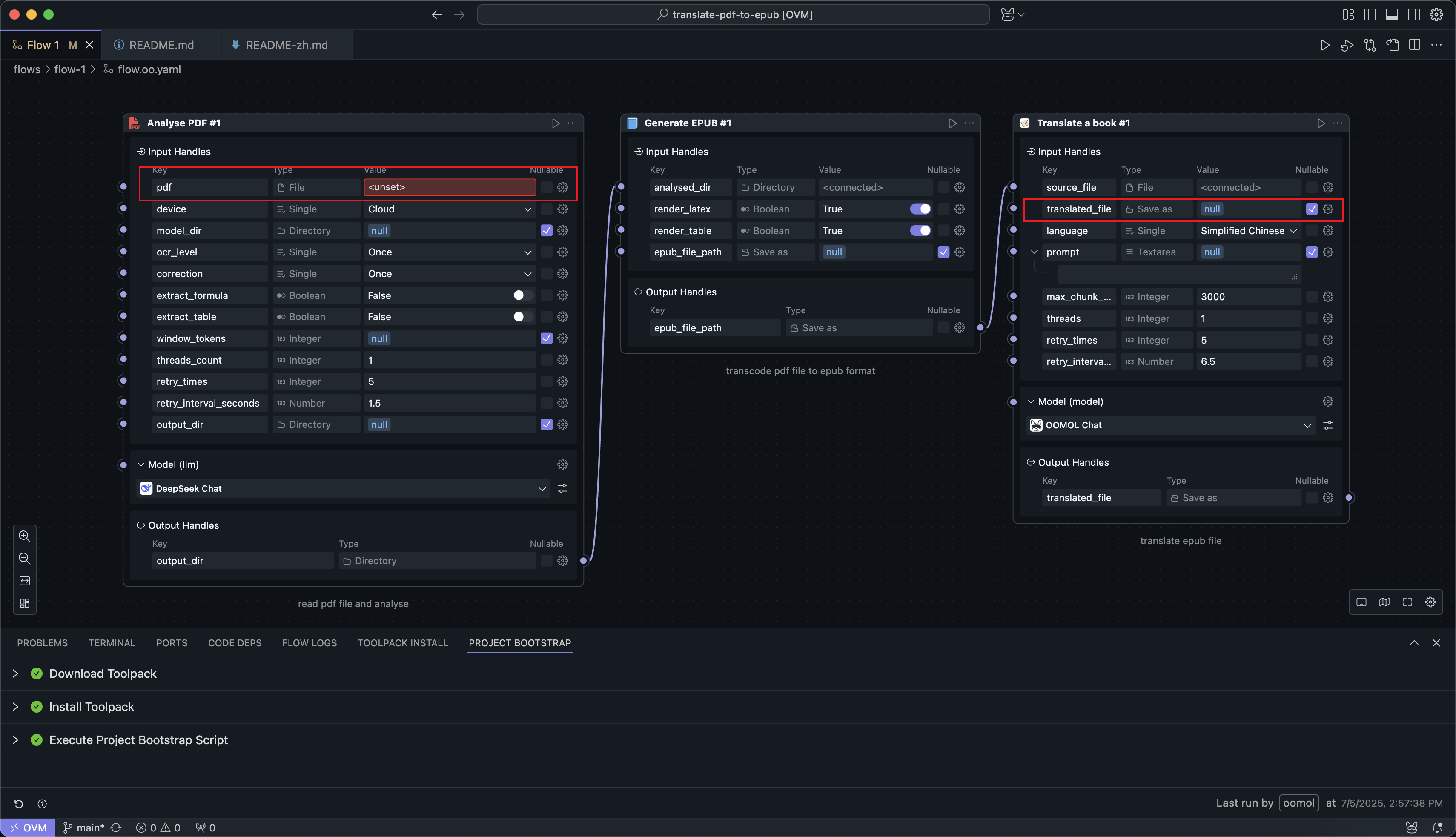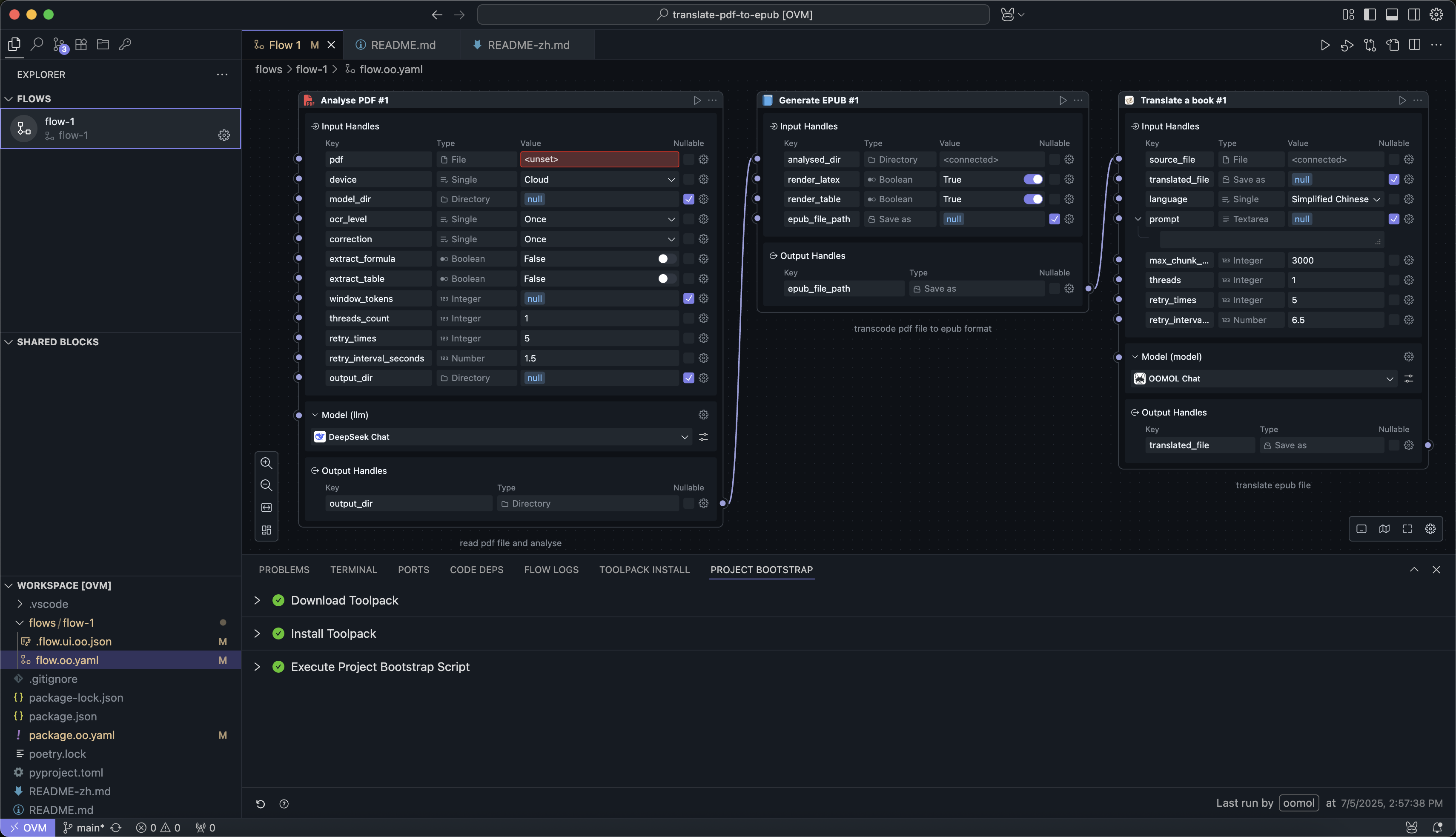 Now you can achieve this with OOMOL Studio. In this article, I will detail how to export a Workflow as an image and run it in the background. I will implement a Workflow that translates a PDF and converts it to an EPUB e-book, allowing me to read literature from foreign authors on my mobile device without language barriers.