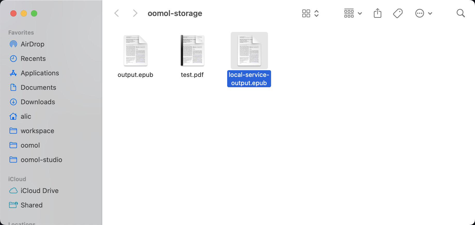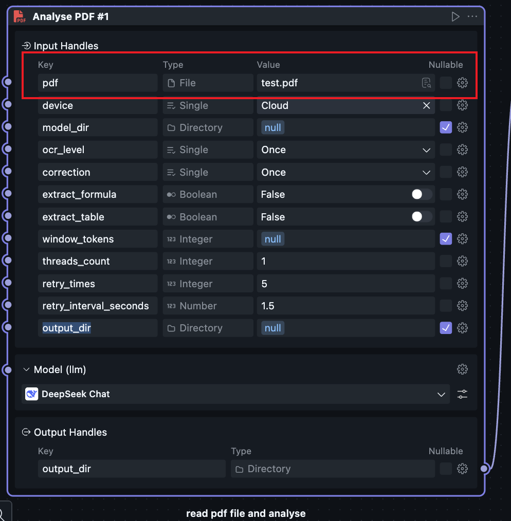 Here, the input file path is /oomol-driver/oomol-storage/test.pdf. Since we previously mapped the /oomol-driver/oomol-storage folder to $HOME/oomol-storage during Running the Image, simply place test.pdf in $HOME/oomol-storage, and the Workflow can read the file. We name the output file local-service-output.