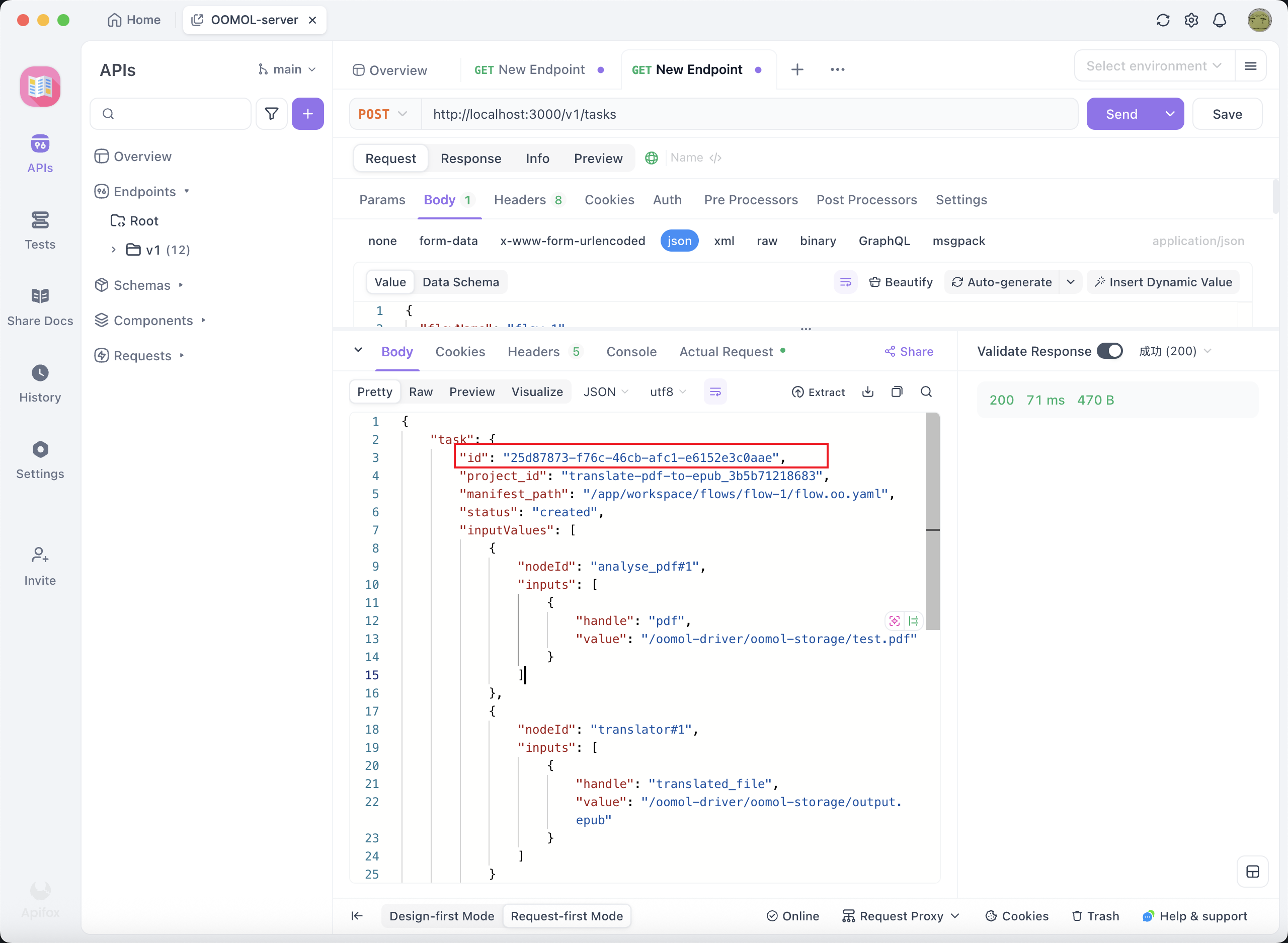Use the POST method to call http://localhost:3000/v1/tasks to run a Workflow and create a task.