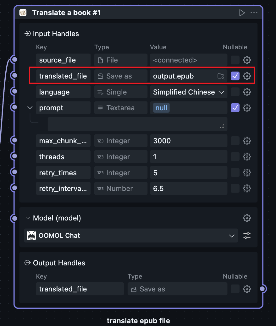 The Translate epub book Block's default output language is Chinese. Adjust the parameters as needed.