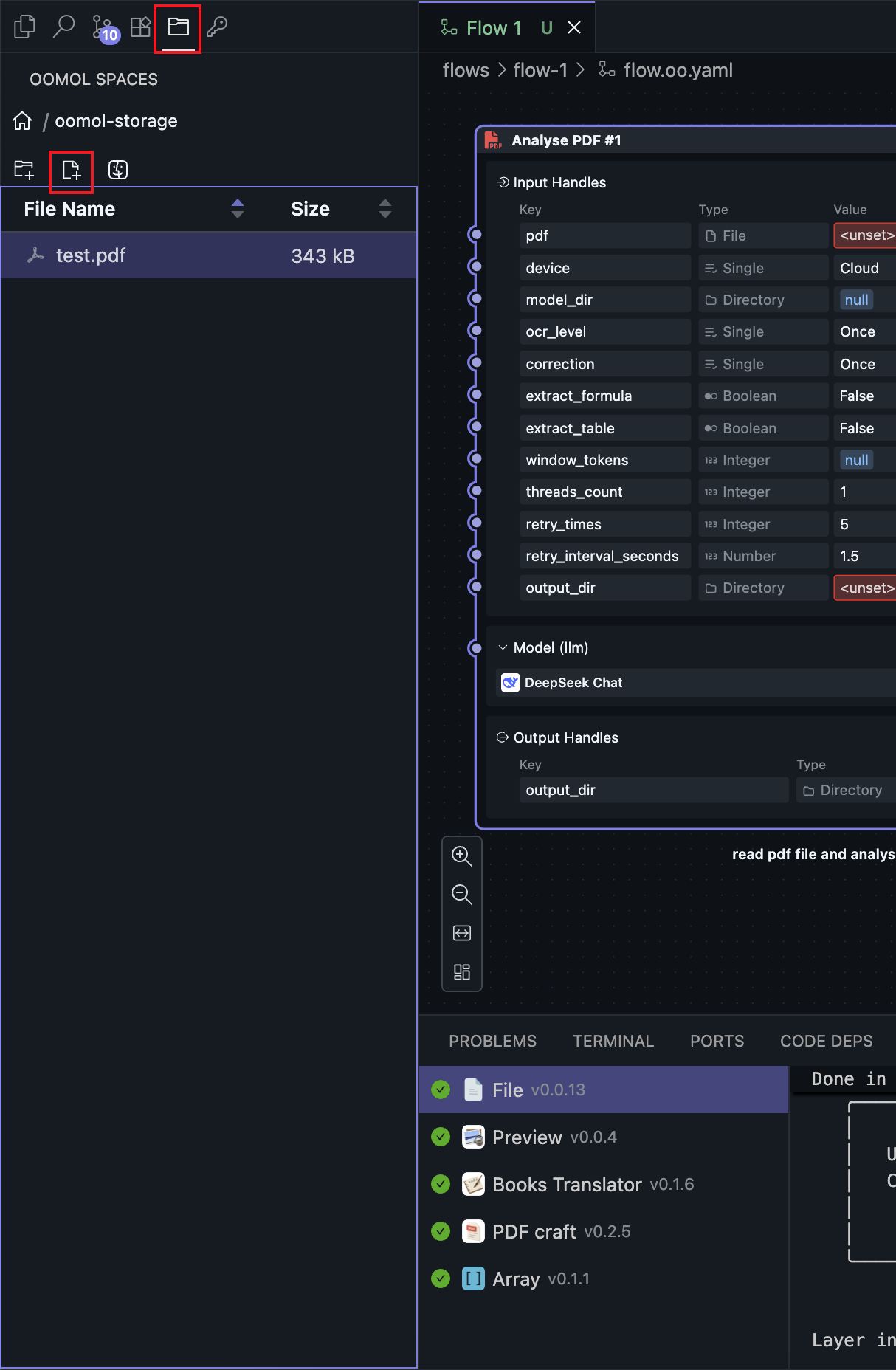 Since the PDF file input requires a PDF address, we need to place the PDF file to be processed into the OOMOL Studio environment so the application can read it. Copy the file into the OOMOL space from the left panel: