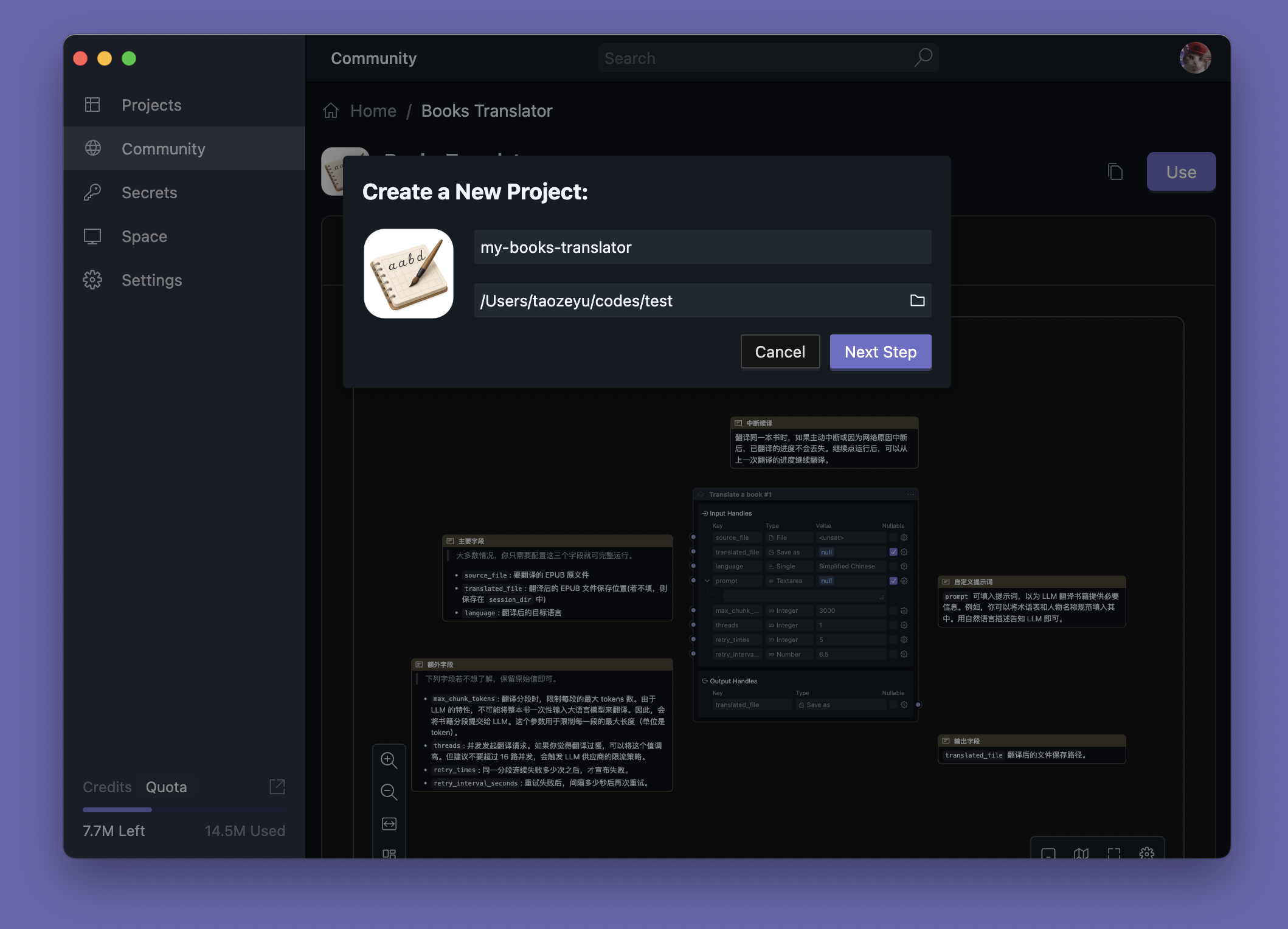 First, enter the Community page in the left navigation bar and search for the "books rranslator" template. This preset template contains all the necessary operating environment and configuration. Click the "Use" button to quickly initialize a new project. The system will automatically create a workspace containing all the dependencies of epub-translator, and there is no need to manually install any components.