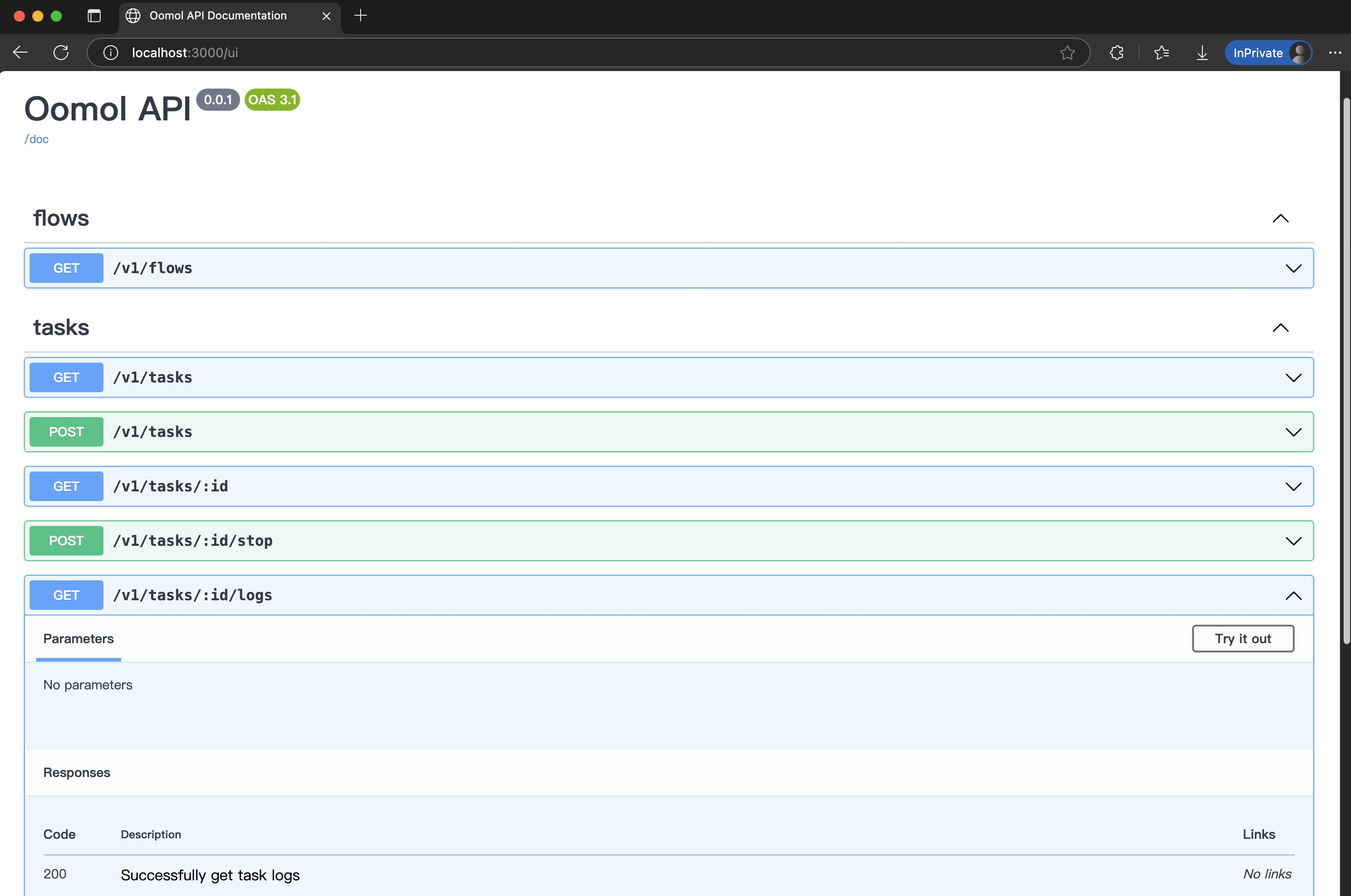 You can now query workflows and their parameters by requesting http://localhost:3000/v1/flows. For example: