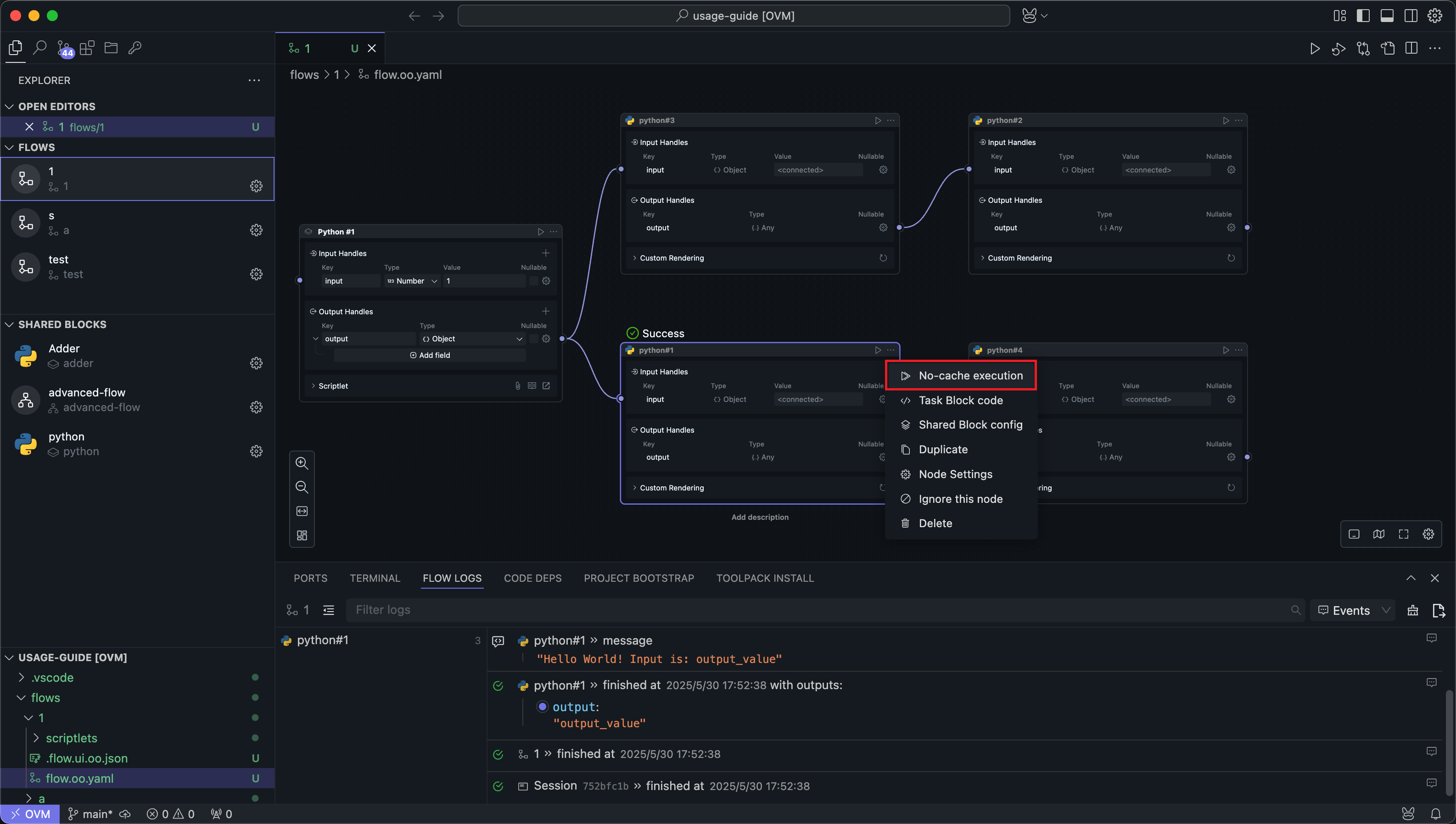 After running the Flow using any method, the log panel at the bottom will display the run logs. Each run will record the latest logs, overwriting the previous logs.