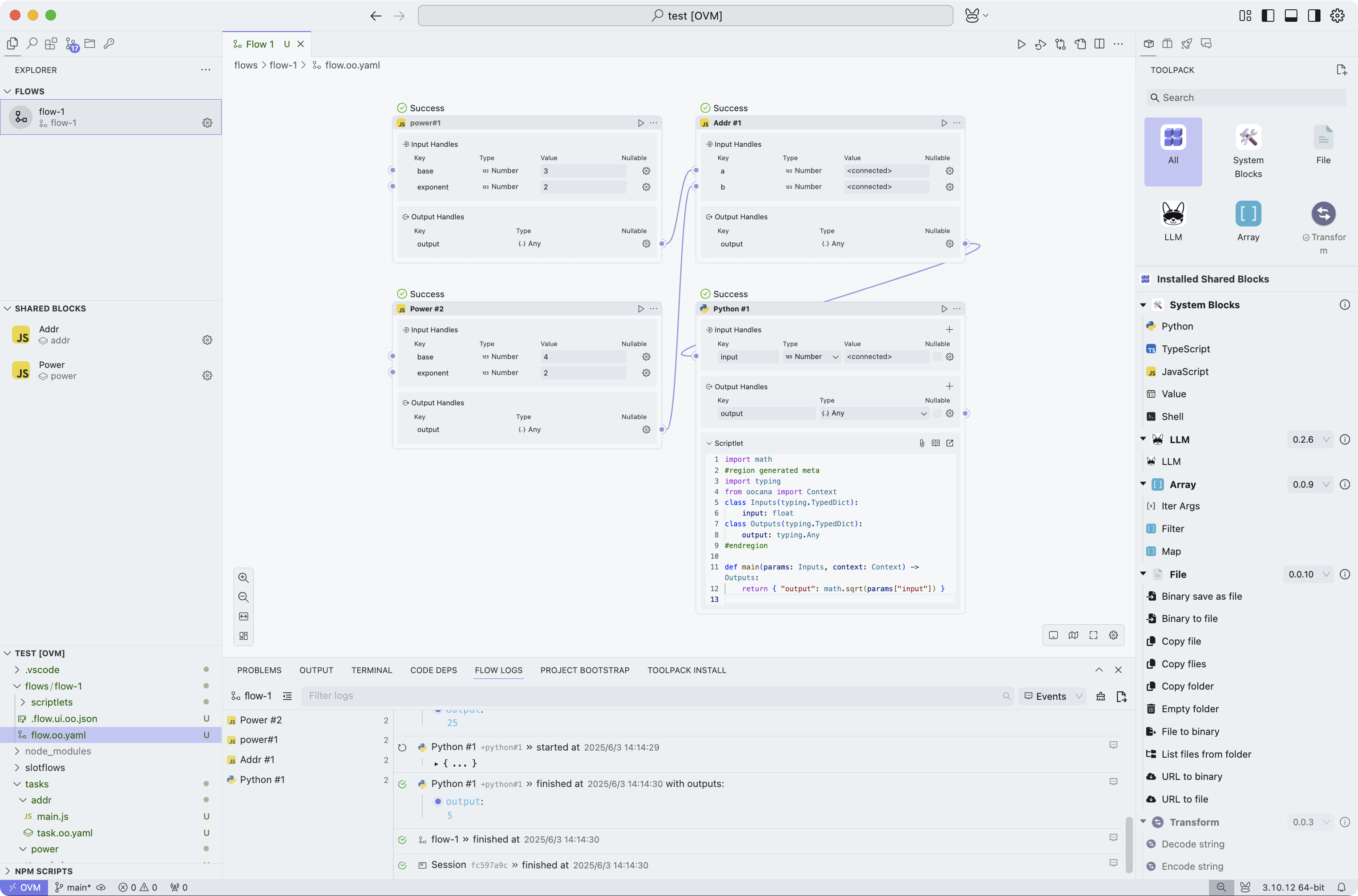 You can see that multiple blocks are combined together in the Flow, forming a complete Flow to calculate the length of the hypotenuse of a right triangle. Each task block can run and be tested independently. They can be reused in other Flows and can also be combined across different programming languages.