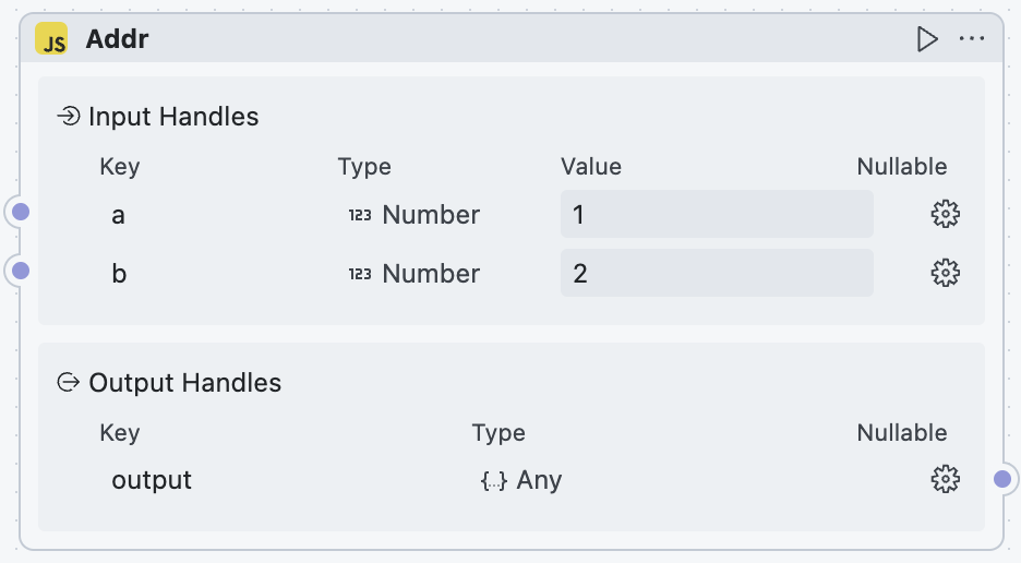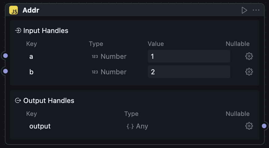 Now, we will drag two exponentiations and one adder into the Flow and connect the outputs of the first two exponentiations to the inputs of the adder. This way, we can calculate the square of the hypotenuse of the right triangle. In the example below, we set the input of the first exponentiation to 3 and the input of the second exponentiation to 4, so the result of the square of the hypotenuse will be: 3^2 + 4^2 = 25.